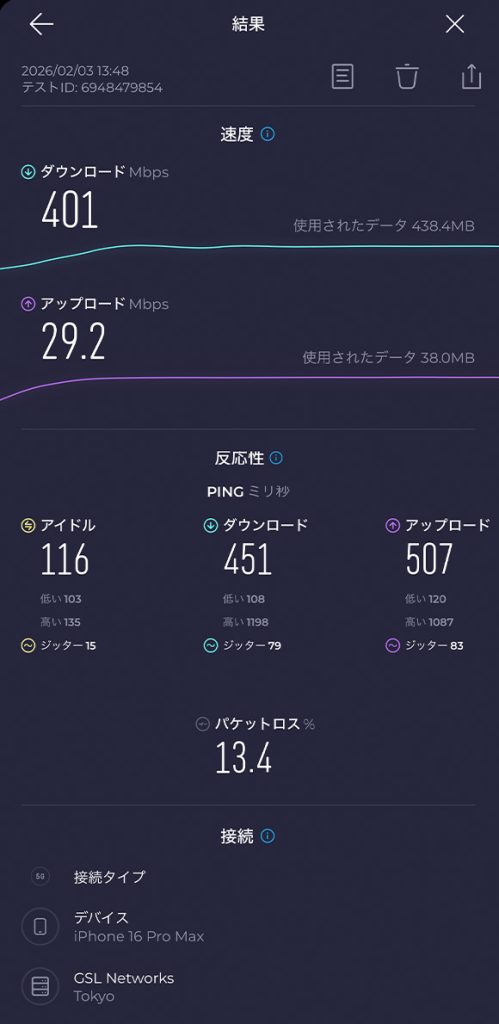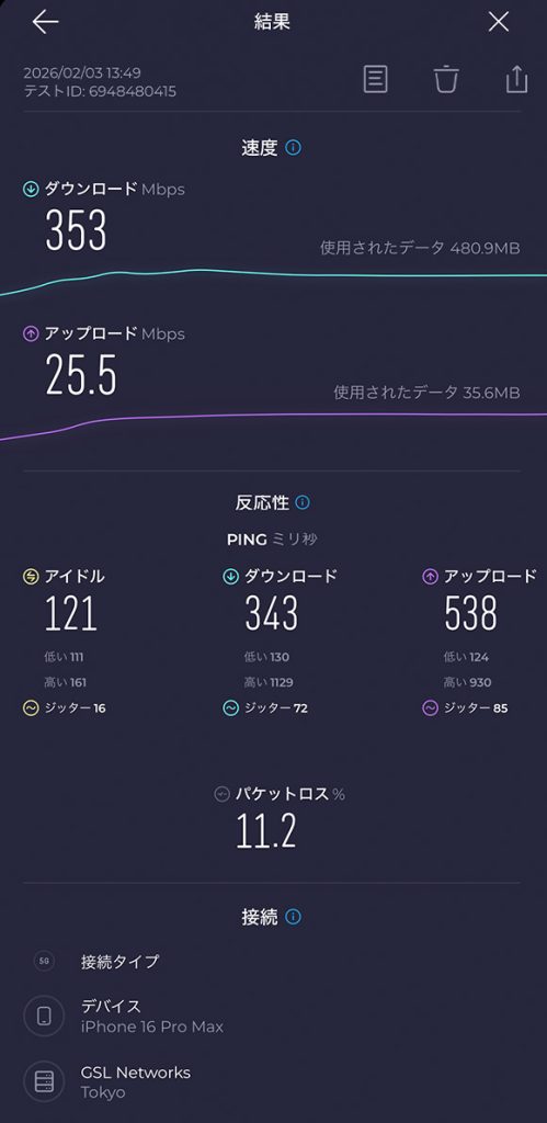 | 2026/2/3 | 13:48 | 353 | 25.5 | ChinaMobile 5G | 東京 |