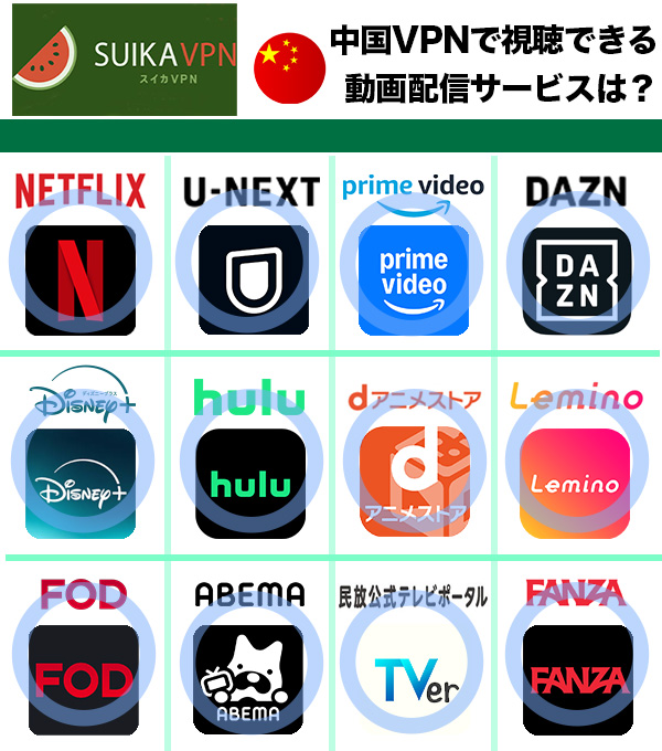 スイカVPNを使って視聴できる日本の動画配信サービスは下記のとおりです。